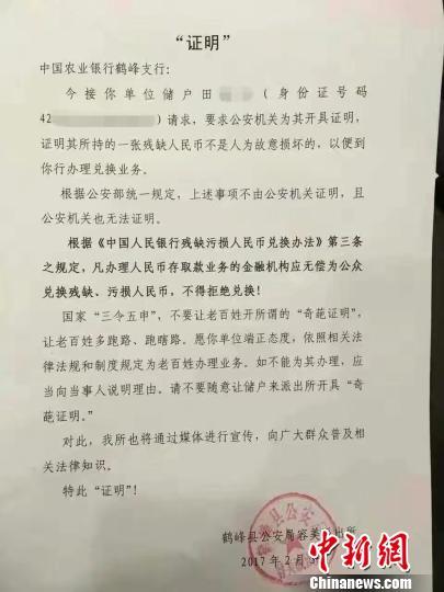 中新网湖北鹤峰2月4日电 (董晓斌 钟欣) 4日,一份盖有湖北鹤峰县公安局容美派出所公章的& 证明&文件在网络热传。该& 证明&落款时间为2月3日,其内容显示,中国农业银行鹤峰县支行的储户田某被要求公安机关为其开具证明,证明其所持一张残缺人民币不是人为故意损坏,以便到该行办理兑换业务。